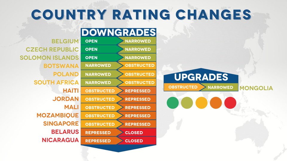 Closed Repressed Obstructed Narrowed Open Download citation Embed Map </> zoom out 0% zoom in Select Country to Embed World Afghanistan Albania Algeria Andorra Angola Antigua and Barbuda Argentina Armenia Australia Austria Azerbaijan Bahamas Bahrain Bangladesh Barbados Belarus Belgium Belize Benin Bhutan Bolivia Bosnia & Herzegovina Botswana Brazil Brunei Darussalam Bulgaria Burkina Faso Burundi Cambodia Cameroon Canada Cape Verde Central African Republic Chad Chile China Colombia Comoros Costa Rica Côte d'Ivoire Croatia Cuba Cyprus Czech Republic Democratic Republic of the Congo Denmark Djibouti Dominica Dominican Republic Ecuador Egypt El Salvador Equatorial Guinea Eritrea Estonia Eswatini Ethiopia Fiji Finland France Gabon Gambia Georgia Germany Ghana Greece Greenland Grenada Guatemala Guinea Guinea Bissau Guyana Haiti Honduras Hong Kong Hungary Iceland India Indonesia Iran Iraq Ireland Israel Italy Jamaica Japan Jordan Kazakhstan Kenya Kiribati Kosovo Kuwait Kyrgyzstan Laos Latvia Lebanon Lesotho Liberia Libya Liechtenstein Lithuania Luxembourg Madagascar Malawi Malaysia Maldives Mali Malta Marshall Islands Mauritania Mauritius Mexico Micronesia Moldova Monaco Mongolia Montenegro Morocco Mozambique Myanmar Namibia Nauru Nepal Netherlands New Zealand Nicaragua Niger Nigeria North Korea North Macedonia Norway Oman Pakistan Palau Palestine Panama Papua New Guinea Paraguay Peru Philippines Poland Portugal Qatar Republic of the Congo Romania Russia Rwanda Saint Lucia Samoa San Marino Sao Tome and Principe Saudi Arabia Senegal Serbia Seychelles Sierra Leone Singapore Slovakia Slovenia Solomon Islands Somalia South Africa South Korea South Sudan Spain Sri Lanka St Kitts and Nevis St Vincent and the Grenadines Sudan Suriname Sweden Switzerland Syria Taiwan Tajikistan Tanzania Thailand Timor-Leste Togo Tonga Trinidad and Tobago Tunisia Turkey Turkmenistan Tuvalu Uganda Ukraine United Arab Emirates United Kingdom United States of America Uruguay Uzbekistan Vanuatu Venezuela Vietnam Yemen Zambia Zimbabwe Or select Region to Embed Africa Central Africa Eastern Africa East & Horn of Africa Northern Africa Southern Africa West Africa Americas Central America The Caribbean Northern America South America Asia East Asia Gulf Countries Middle East Middle East & North Africa South Asia South East Asia Europe and Central Asia Central Asia Europe Oceania Australia & New Zealand Pacific Islands Political Groupings African Union ASEAN BRICS Commonwealth Community of Latin American and Caribbean States Council of Europe East African Community (EAC) Economic Community of West African States European Union G20 G7 Gulf Cooperation Council IGAD NATO OECD Organisation of La Francophonie Pacific Islands Forum Scandanavia South Asian Association for Regional Cooperation Southern African Development Community UN Security Council Western Balkans COPY EMBED CODE Latest updates Panama 2022-02-22 Panamanian journalists warn of threats against freedom of expression more Mexico 2022-02-22 Outrage as five journalists killed in Mexico in early 2022 more Maldives 2022-02-18 Authorities arresting protesters and failing to address reprisals against activists in the Maldives more Japan 2022-02-16 Increasing Twitter takedowns by Japan while teachers and Okinawans hold protests more Cuba 2022-02-15 At least 790 people prosecuted and 172 already convicted for protesting in Cuba more Papua New Guinea 2022-02-15 Despite UN rights review, attacks on press freedom continue in PNG with suspension of journalist more Argentina 2022-02-14 Manifestantes toman las calles para protestar contra el FMI y la minería a gran escala more Afghanistan 2022-02-11 Afghan women activists abducted by the Taliban while journalists arrested and beaten more Fiji 2022-02-09 Civic space remains ‘obstructed’ in Fiji as media attacked, climate march blocked more Nicaragua 2022-02-08 Nicaragua: prosecution and conviction of several political prisoners more Explore all updates prev next Find a country All Americas Europe and Central Asia Asia Oceania Middle East and North Africa Africa -------- Afghanistan Albania Algeria Andorra Angola Antigua and Barbuda Argentina Armenia Australia Austria Azerbaijan Bahamas Bahrain Bangladesh Barbados Belarus Belgium Belize Benin Bhutan Bolivia Bosnia & Herzegovina Botswana Brazil Brunei Darussalam Bulgaria Burkina Faso Burundi Cambodia Cameroon Canada Cape Verde Central African Republic Chad Chile China Colombia Comoros Costa Rica Côte d'Ivoire Croatia Cuba Cyprus Czech Republic Democratic Republic of the Congo Denmark Djibouti Dominica Dominican Republic Ecuador Egypt El Salvador Equatorial Guinea Eritrea Estonia Eswatini Ethiopia Fiji Finland France Gabon Gambia Georgia Germany Ghana Greece Greenland Grenada Guatemala Guinea Guinea Bissau Guyana Haiti Honduras Hong Kong Hungary Iceland India Indonesia Iran Iraq Ireland Israel Italy Jamaica Japan Jordan Kazakhstan Kenya Kiribati Kosovo Kuwait Kyrgyzstan Laos Latvia Lebanon Lesotho Liberia Libya Liechtenstein Lithuania Luxembourg Madagascar Malawi Malaysia Maldives Mali Malta Marshall Islands Mauritania Mauritius Mexico Micronesia Moldova Monaco Mongolia Montenegro Morocco Mozambique Myanmar Namibia Nauru Nepal Netherlands New Zealand Nicaragua Niger Nigeria North Korea North Macedonia Norway Oman Pakistan Palau Palestine Panama Papua New Guinea Paraguay Peru Philippines Poland Portugal Qatar Republic of the Congo Romania Russia Rwanda Saint Lucia Samoa San Marino Sao Tome and Principe Saudi Arabia Senegal Serbia Seychelles Sierra Leone Singapore Slovakia Slovenia Solomon Islands Somalia South Africa South Korea South Sudan Spain Sri Lanka St Kitts and Nevis St Vincent and the Grenadines Sudan Suriname Sweden Switzerland Syria Taiwan Tajikistan Tanzania Thailand Timor-Leste Togo Tonga Trinidad and Tobago Tunisia Turkey Turkmenistan Tuvalu Uganda Ukraine United Arab Emirates United Kingdom United States of America Uruguay Uzbekistan Vanuatu Venezuela Vietnam Yemen Zam